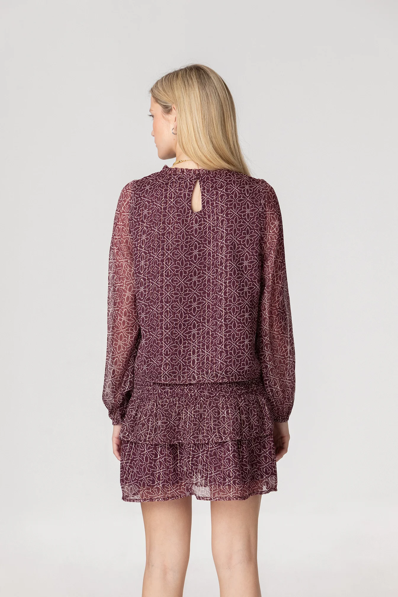 Blusa Estampada con Detalles de Fruncidos Color Burdeos. Tejido suelto que aporta movimiento a la prenda. Puños elástico y detalle de lurex. Combínala con la falda a juego y consigue un total look ideal para cualquier ocasión.