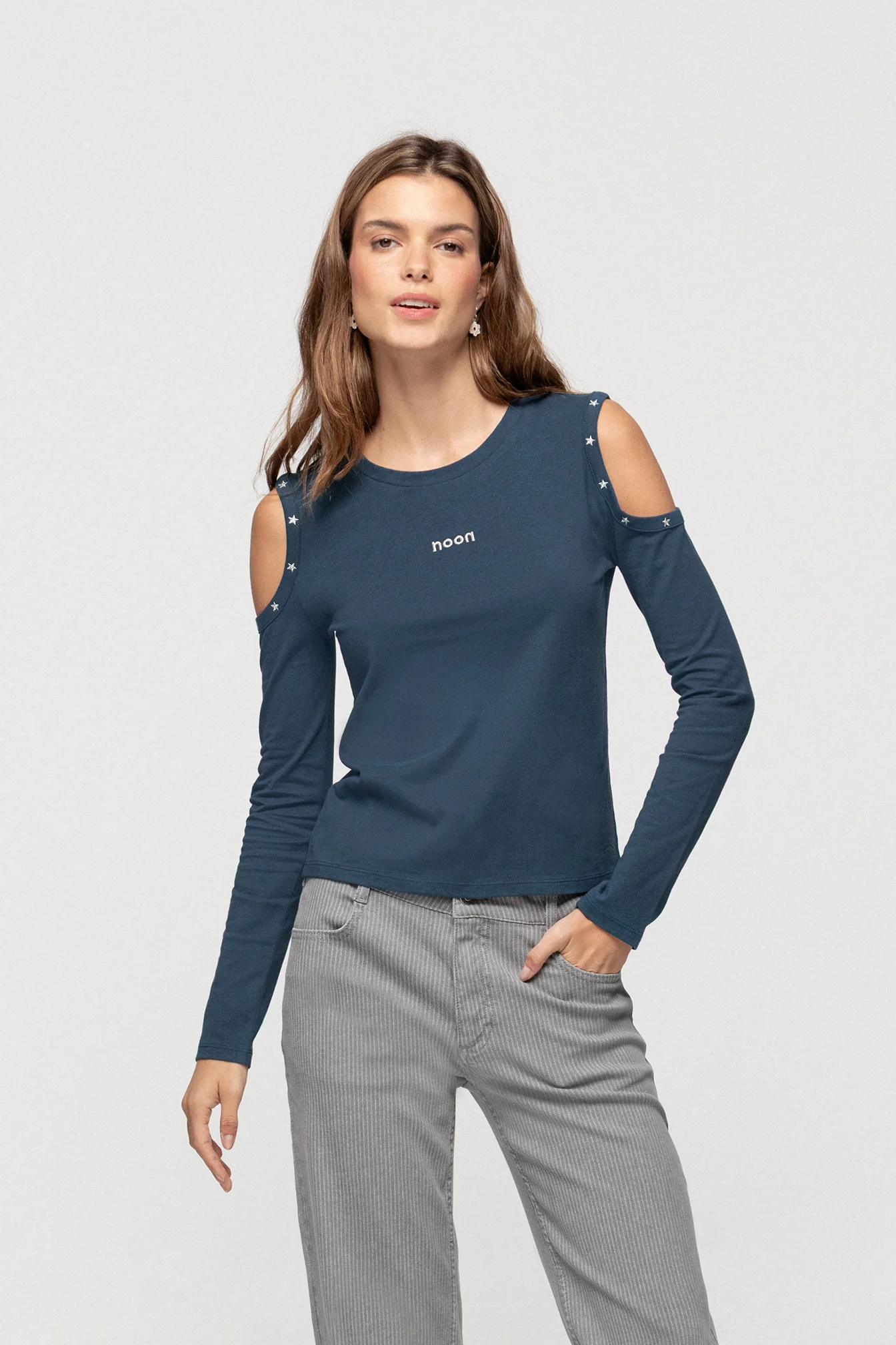 Camiseta de Manga Larga con Hombros al Aire. Abertura en los hombros que aporta un toque juvenil a la prenda. Detalle de tachuelas en los hombros. Logo de noon bordado. Tejido suave y cómodo. Disponible en varios colores para que elijas tu favorita. ¡Consíguela ya!