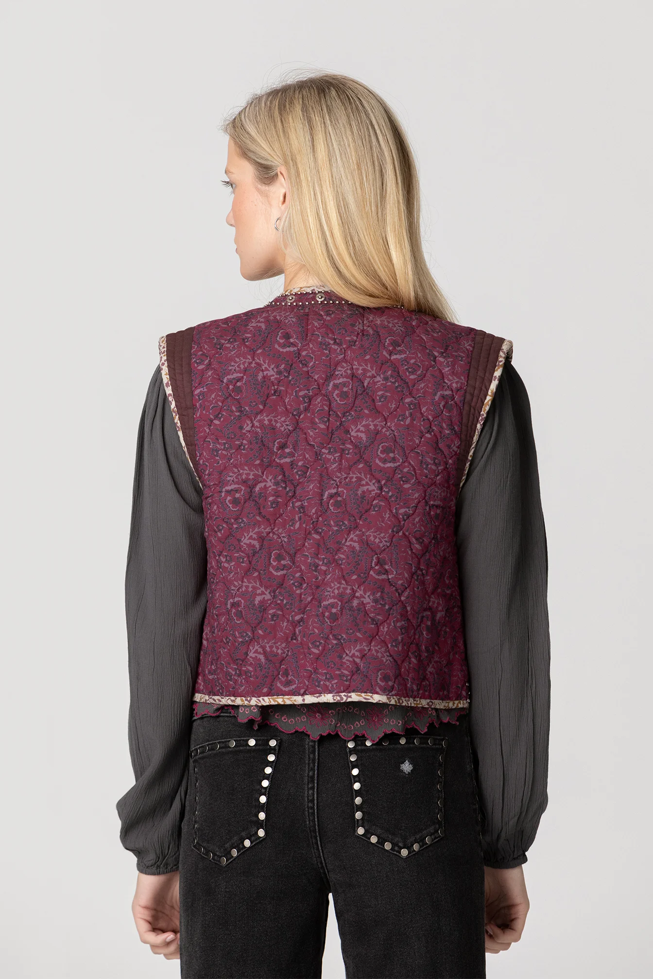 Chaleco Sin Mangas Enguatado Color Rosa. Detalle de estampado de flores y Tachuelas. Forro interior. ¡Combínalo con cualquiera de nuestras blusas y consigue un look ideal y en tendencia!