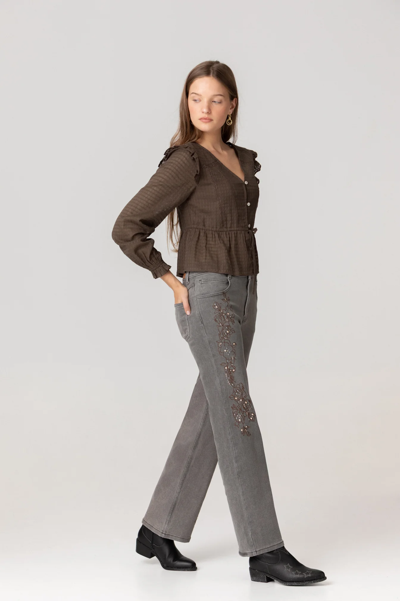Jeans de Talle Medio Con Bordado de Flores Color Gris. Corte recto que marca tendencia. Los detalles aportan un toque más juvenil a la prenda. Bordado en tendencia esta temporada. ¡Dale un toque diferente a tus looks con este nuevo Jeans!