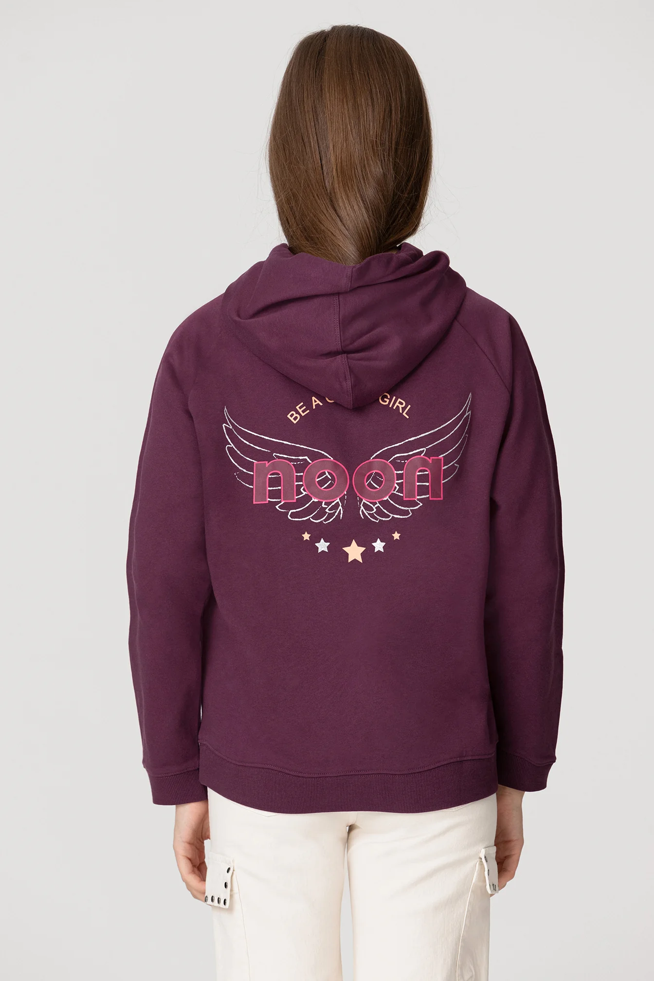 Sudadera con Capucha y Estampado en la Espalda. Detalle de estampado con el logo de noon, alas y estrellas en la espalda. Goma elástica en puños y bajo. Logo bordado en la parte delantera. ¡Consigue ya la sudadera en tendencia y siéntete una noongirl!
