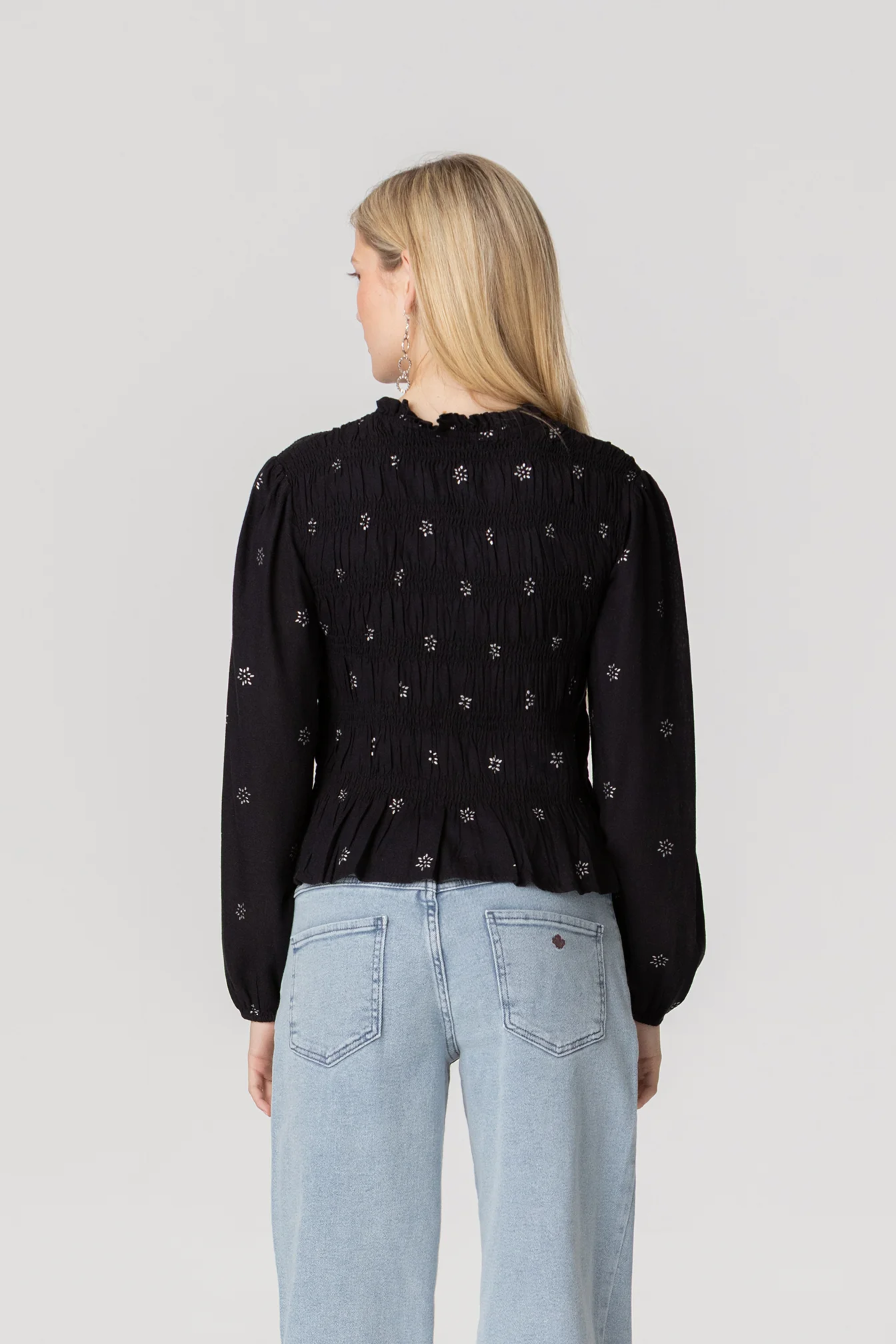 Top de Manga Larga Estampado en Tono Antracita. Manga fluida y cuerpo fruncido que se ajusta realzando la figura. Escote con lazada. ¡Dale un toque elegante a tus looks del día a día con esta prenda!