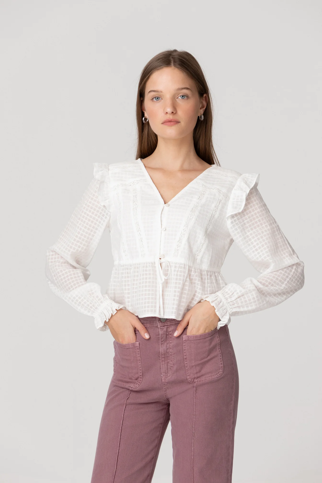 Blusa Blanca de Manga Larga con Volantes en los Hombros. Escote de Pico. Detalle de calados que aportan un toque elegante a la prenda. ¡Combínala con cualquiera de nuestros jeans y consigue un total look para el día a día!