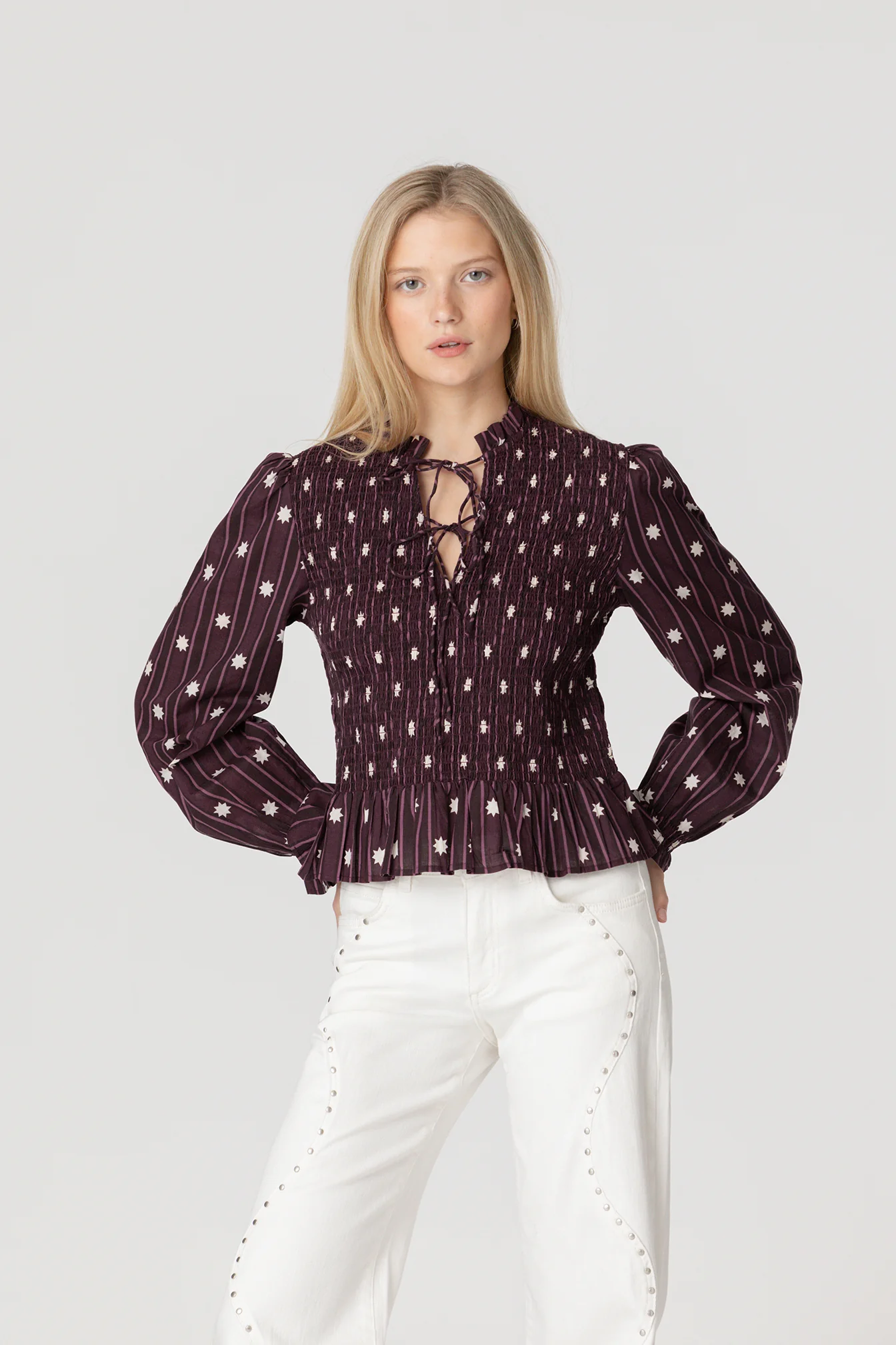 Top de Manga Larga Estampado en Tonos Burdeos. Manga fluida y volantes en el cuello, puños y bajo que aportan movimiento a la prenda. Escote con lazada. Cuerpo fruncido que se ajusta perfectamente y realza la figura. ¡Dale un toque elegante a tus looks del día a día con esta prenda!