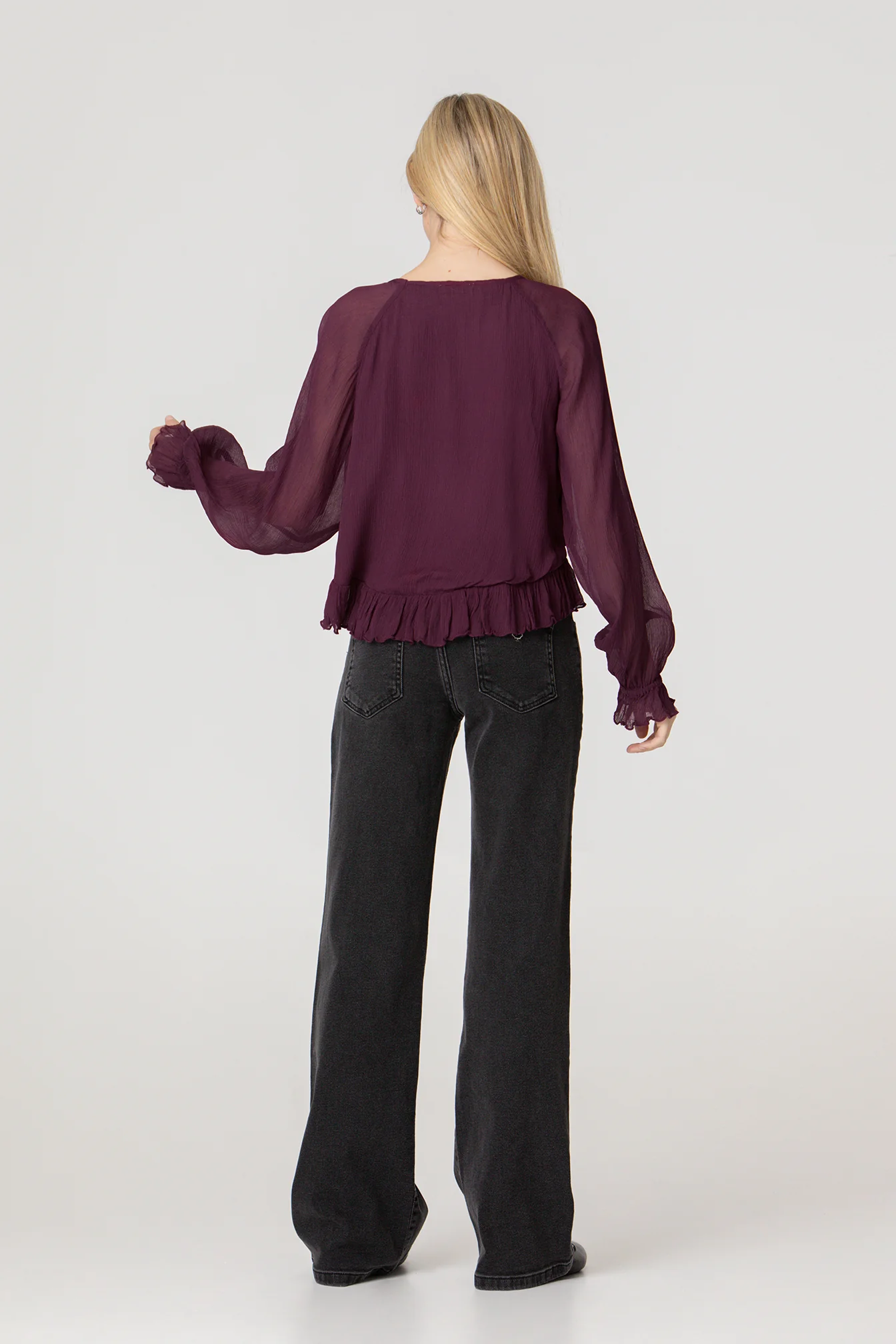 Top de Manga Larga con Detalle de Volantes. Color burdeos. Manga fluida y volantes que aportan movimiento a la prenda. Lazadas delanteras para un ajuste perfecto. ¡Se convertirá en un imprescindible de tu día a día!